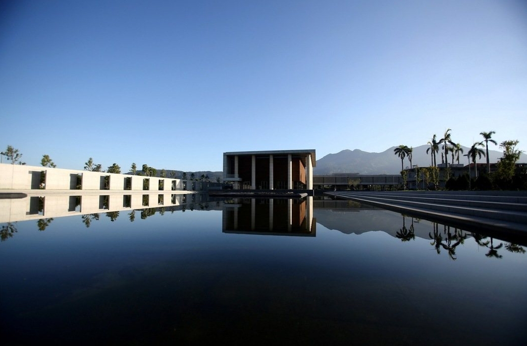 姚仁喜設計了長達八十公尺的水池,藉由水面倒影,將整座建築的虛幻之美映現出來。更具詩意的是,他將長達兩百六十字的經文,透過光影鏤刻的手法,讓經文投射在地面上、爬上牆面,甚至在圓柱上隨著太陽轉動。這不僅用自然光創造出儀式感,也讓整個空間充滿了經文的意境。讓許多人進入這寧靜的空間,即便外在世界紛擾吵雜,亦能感受到內心的安定。他相信,環境與建築的氛圍,能夠潛移默化人的心性。