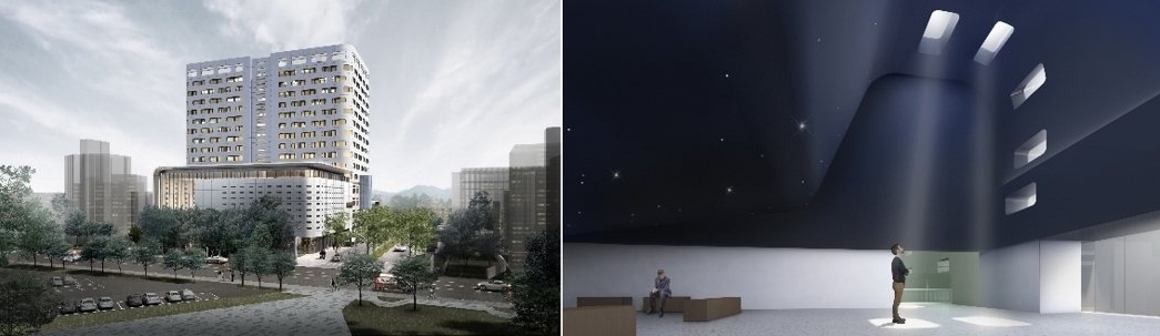 而手術室的等候區往往是醫院中最被忽視、卻也最令人不安的空間。他將其設計成類似教堂的氛圍:採用深藍色調,光線從上方投射,藉由莊嚴的儀式感來穩定家屬等待的心緒。此外,他特別為高壓的醫護人員設計了專屬的休息空間,作為壓力釋放的緩衝。